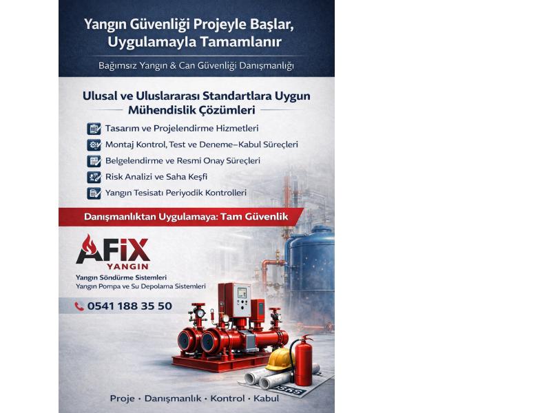 TEKLİF İSTEAFİX Yangın yalnızca danışmanlık hizmeti sunan ya da sadece uygulama yapan bir firma değildir. Projelendirme aşamasından uygulamaya, test ve denetim süreçlerinden devreye almaya kadar yangın güvenliği sürecinin tamamında aktif rol alır ve projeyi baştan sona sahiplenir. Tüm çalışmalar Binaların Yangından Korunması Hakkında Yönetmelik, ilgili ISO, TSE, CE ve ulusal–uluslararası standartlar esas alınarak yürütülür. Böylece projelerimiz mevzuata tam uyumlu, denetlenebilir ve onaylanabilir nitelik kazanır. Bu yaklaşım sayesinde güvenlik, yalnızca bir vaat değil ölçülebilir, doğrulanabilir ve sürdürülebilir bir sonuç haline gelir.